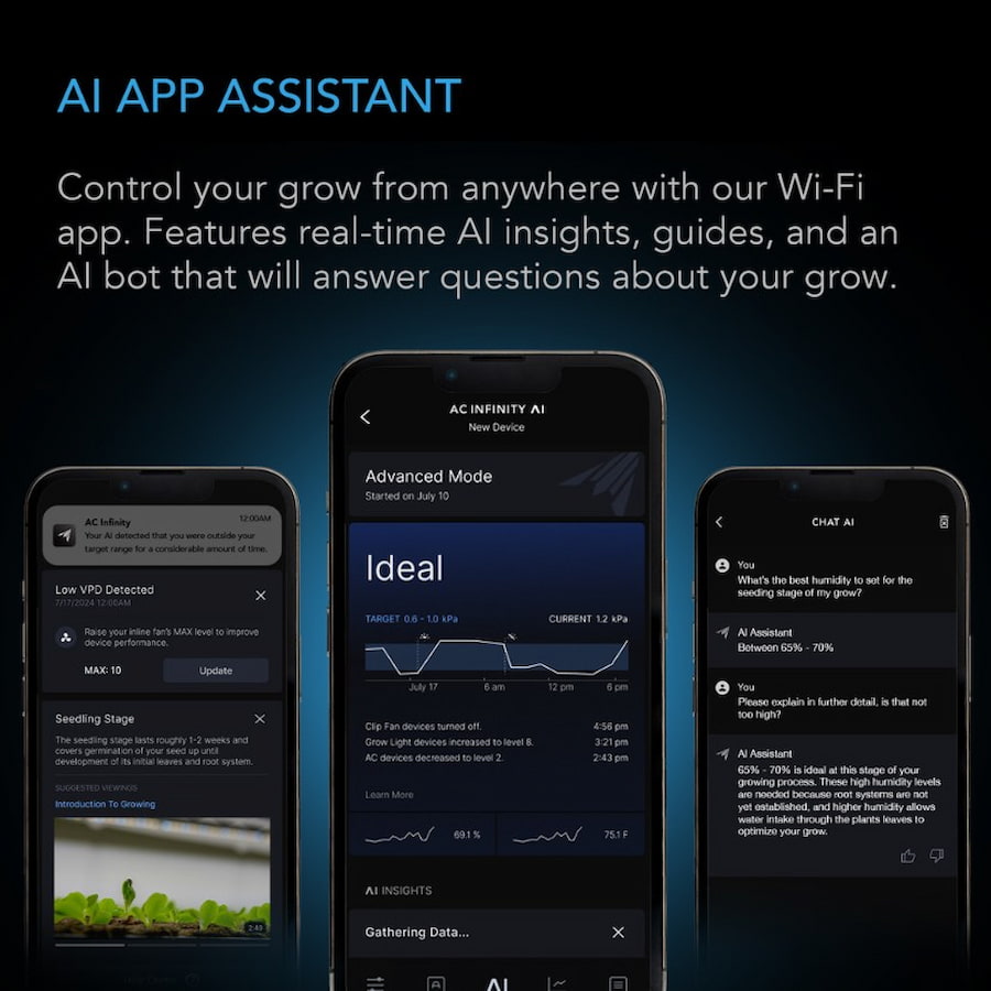 • Control your setup from anywhere via WIFI with our app, featuring real-time AI insights, guides, alerts, charts, and the ability to chat with our AI bot about your grow.