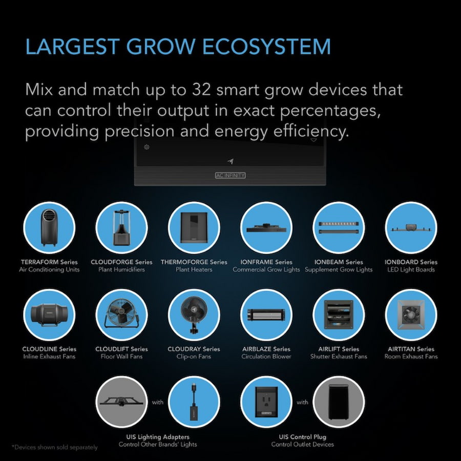 • Mix and match up to 32 devices from the largest platform of smart fans, grow lights, humidifiers, heaters, A/Cs, and grow lights & outlet devices from other brands.